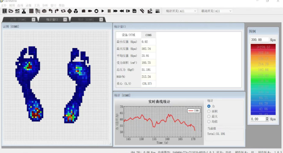 * 軟件界面實(shí)時(shí)顯示最大壓強(qiáng)、最小壓強(qiáng)、平均壓強(qiáng)、受力面積、總壓力和重心等數(shù)據(jù)。